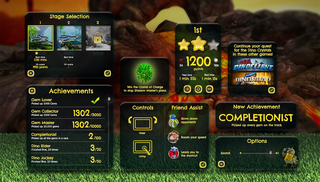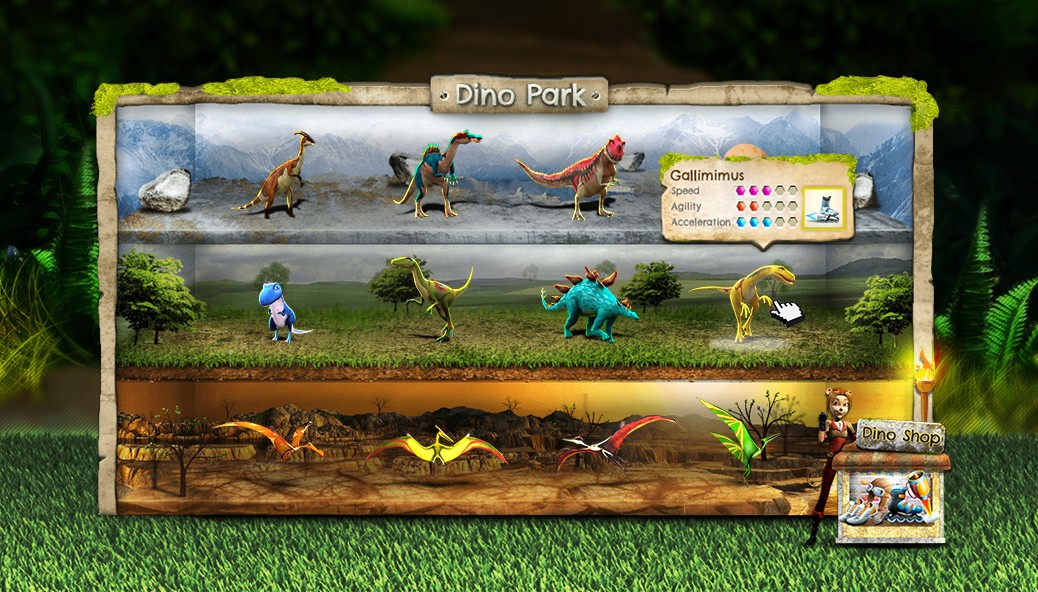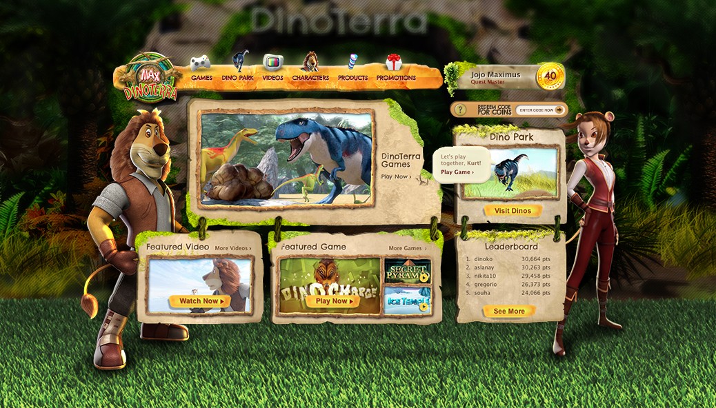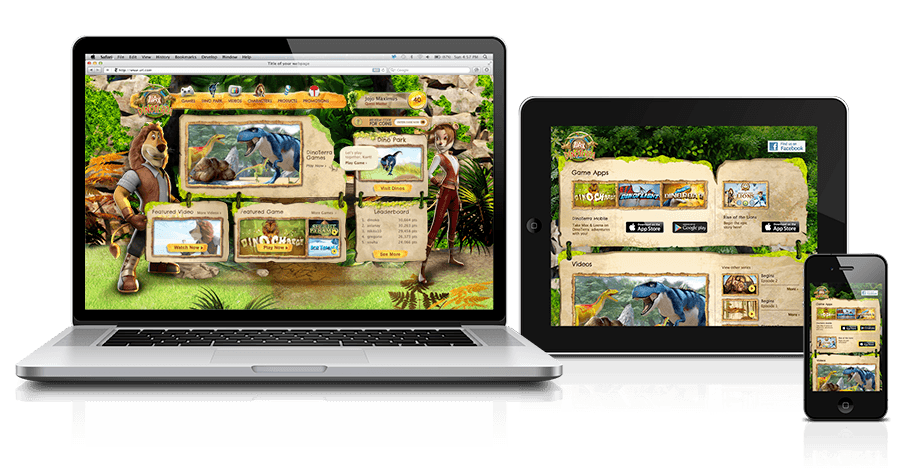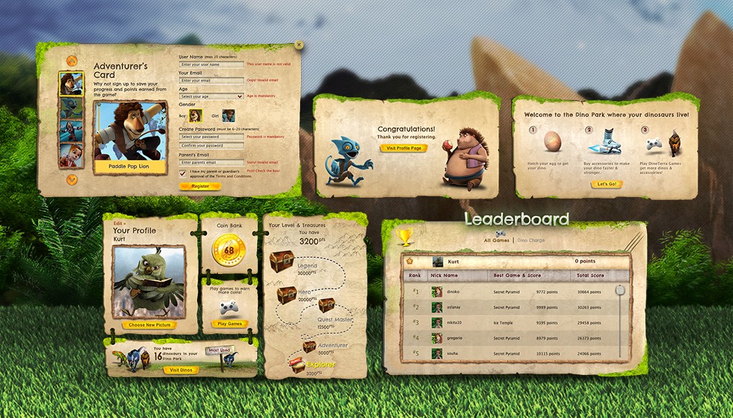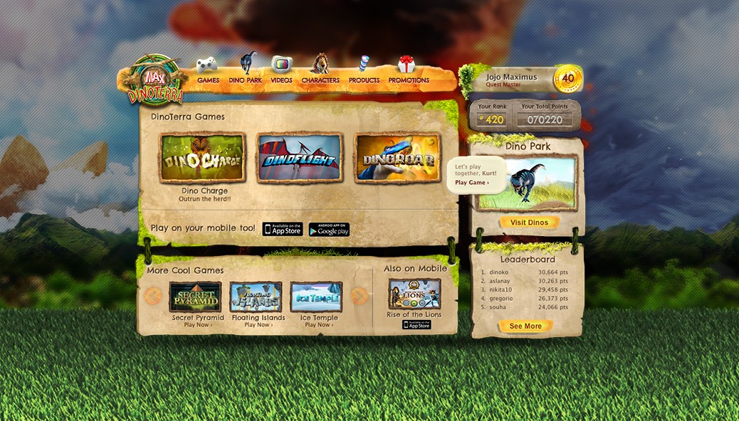 Each game was crafted to complement their animated series with environments inspired by the show. Players were able to collect virtual dinosaur pets and accessories for competing in dinosaur-themed games. The biggest challenges were recreated the environments. Brand assets weren't enough in providing the necessary elements for engagement, so a lot of heavy digital imaging work was done in Photoshop by sampling the animated series. Custom brushes and layer styles were also created to paint stone, grass, and vine textures.