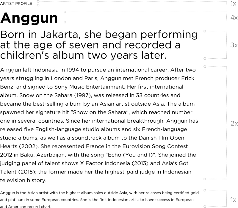 A modular font scale of 1.4x was used to define a family of four sizes for the app. Individual line heights were also defined for legibility, decreasing as font sizes increased.
