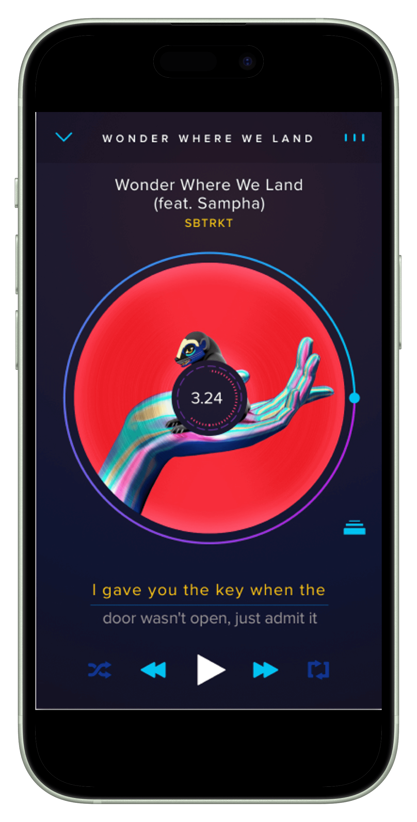 Tapping on the lyrics at the bottom pulls up the Lyrics overlay. Fast-forwarding of the track (or back) can be done by vertically scrolling the lyrics.