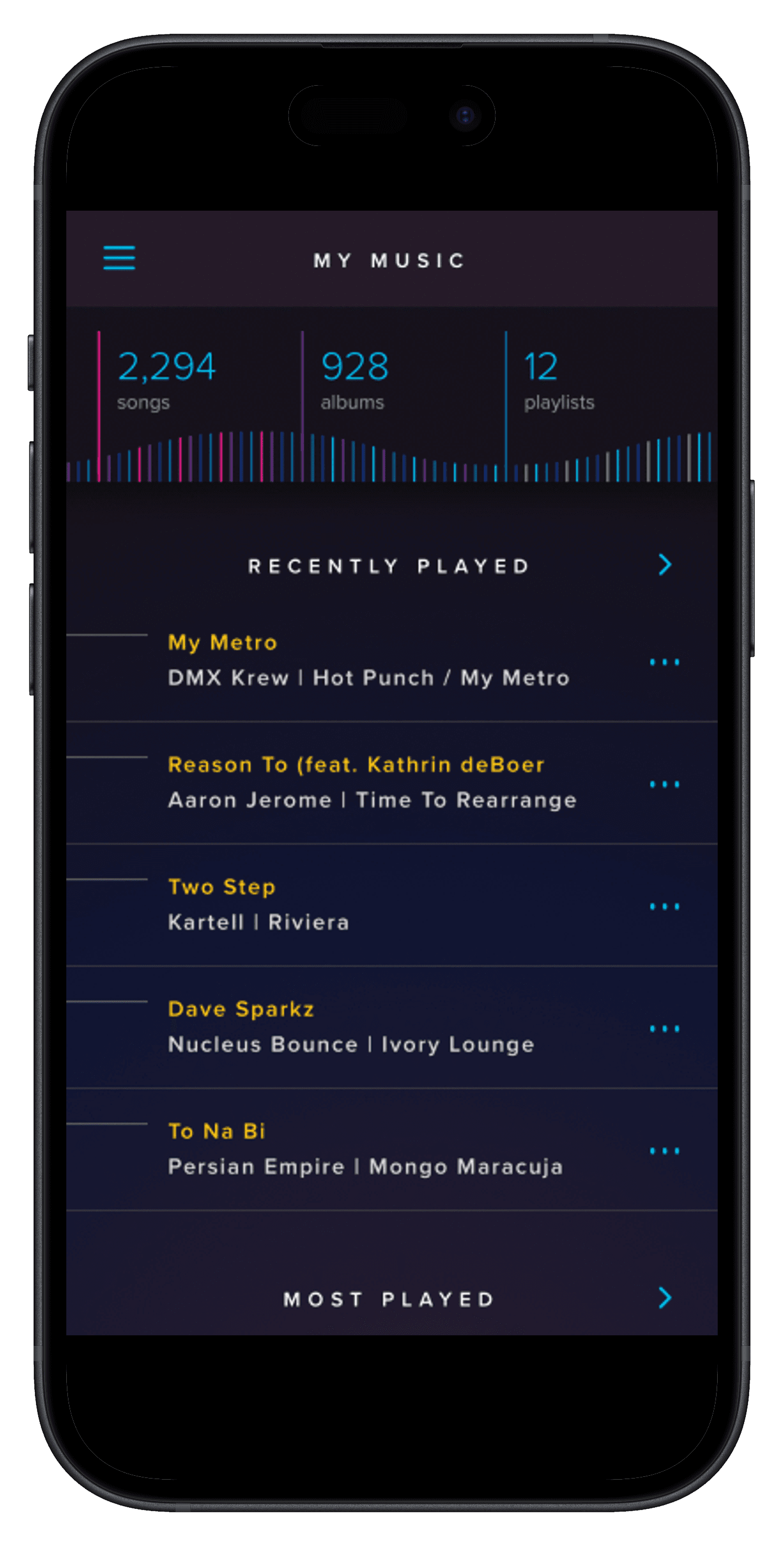 A sine wave animation acts as the track status when the track is played in the Track List view. Tapping on the control bar at the bottom brings up the Music Playback view.